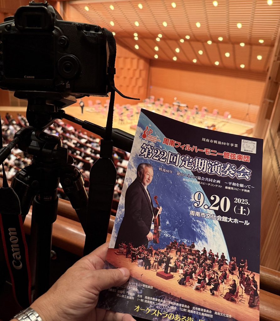 No.540 プロ中のプロの演奏 sanbuichi-koji, 2025年9月20日 周南フィルハーモニー管弦楽団の第22回定期演奏会のスチール撮影に。もう10年以上、この市民オーケストラの設立からずっと関わっているので、撮影は半分趣味みたいなもの。今回は、指揮&ヴァイオリン独奏のゲストとして、世界的に有名な篠崎史紀さんという方が参加されるので、超一流の演奏家が加わると市民オーケストラはどうなるのか?それも楽しみだった。 ヴァイオリンって、こんな音が出るの?というくらい、『雑味の微塵も感じられない繊細な音』と、かたや『3台分のヴァイオリンが鳴ってる!』と思えるような重厚な音色。プロの演奏ってこれなんや、と驚愕の連続だった。 2階から眺めると、こんなに文化会館が立錐の余地もないほど埋まったのはあまり見たこと無いほど満席だった。そして演奏終了後の拍手が・・・鳴り止まない。アンコール篠崎氏の独奏が終わるまで約10分間拍手が鳴り止まなかったこんなのも初めて見た。今日のお客さんラッキーだ。 日々の感想