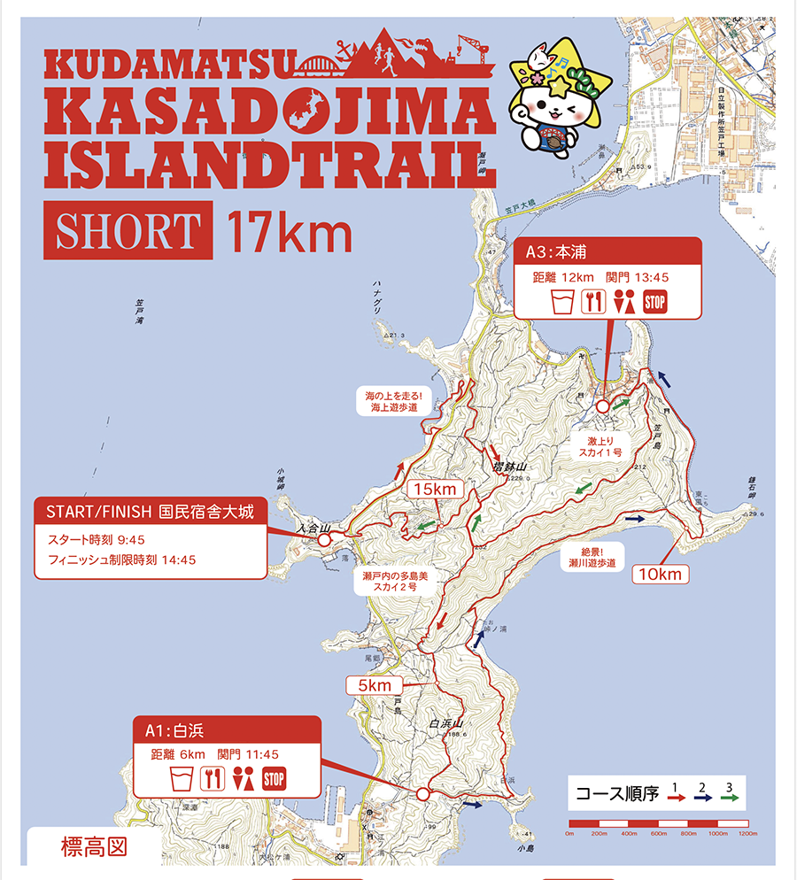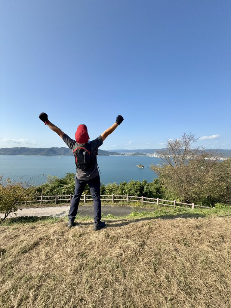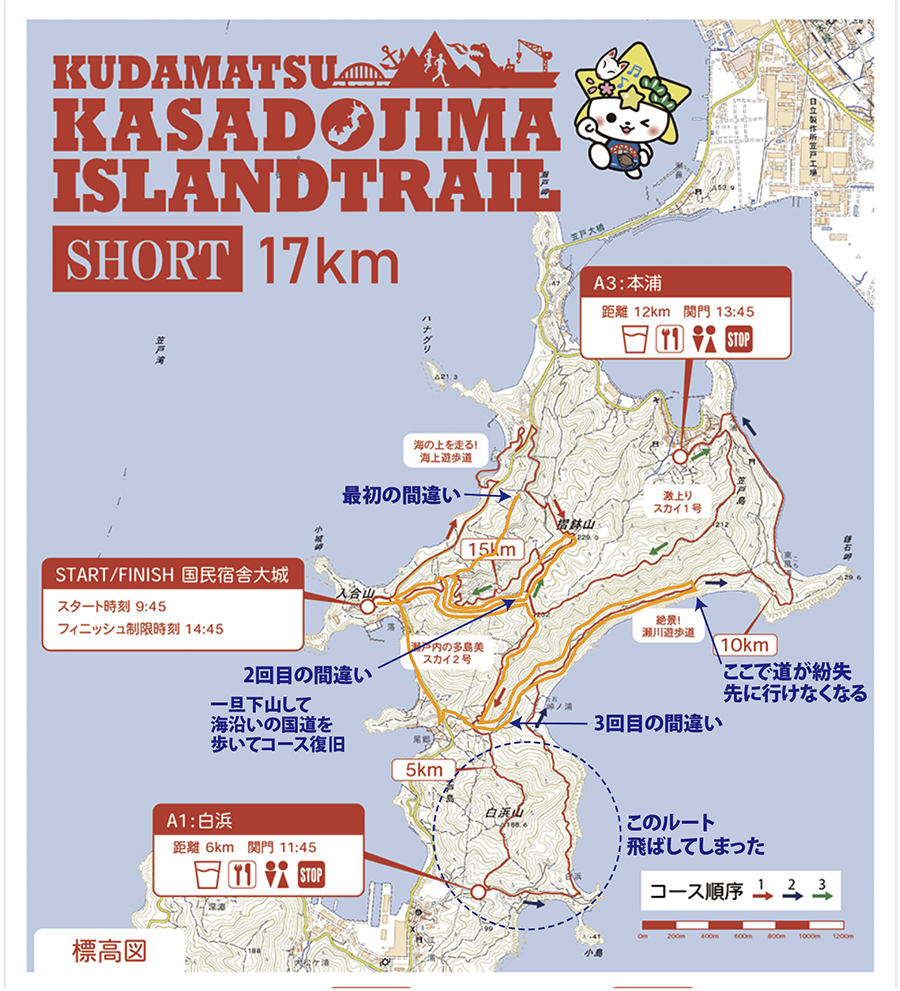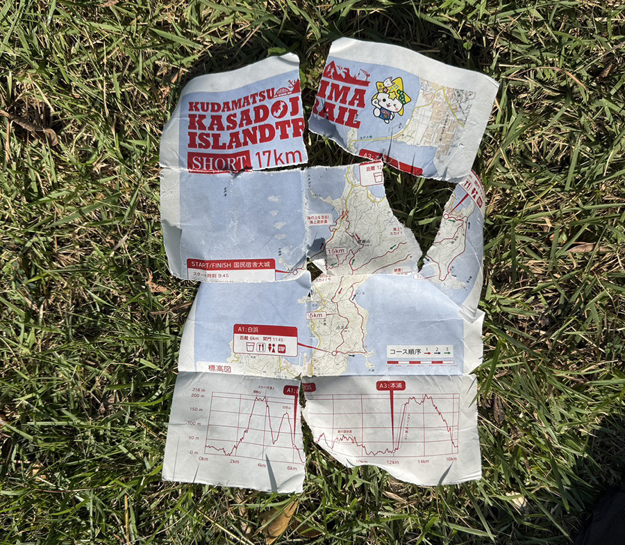 No.563 Dangeros Island KASADOJIMA sanbuichi-koji, 2025年10月13日 スポーツの日の孤独な挑戦。笠戸島トレイルランのコースの独り歩きをしてみた。結果は泣きそうなくらいの大惨敗。 このコースマップを印刷して持ち歩いたが、それが大失敗の始まりだった。 スタート直後は、「海のプロムナード」という海上に造られた最高に気持ちいい道。釣りのメッカ。 絶景を楽しめるが、もうこの時点で道を間違えていた。 来年2月の大会前にはコースが多分少しは整備されると思うけど、 まともに歩けないような小道が相当続いて、「このまま進んでも大丈夫なのか?」と不安になりながら進み、樹木が繁った道は雑草が生えないのでまだ道らしきものがわかるが、 樹木が途切れて直射日光が当たるやいなや、背丈よりも高い雑草が行手を阻んで、完全に道を見失う。片側には崖でその先には海があるので、怖くてこれ以上前に進めない。Uターンしか無い。「今来た道をまた延々と戻るのか・・・・」と、テンションが激下がり。 コースマップとスマホのGoogle mapを照らし合わせながら・・・もう汗でコース図がぐしゃぐしゃに。 笠戸島、地図の左側は絶景を楽しみながら歩けるが、山を越えて右側は全く整備されていない「獣道」のような細い道で、大会の時には「トレイルラン」というぐらいだから猛者たちは「走って」通過するのだろうが、危険すぎる! 最後にやけくそでこんなポーズの写真を撮ってみた。トレイルランのコースは想像以上に「険しい」アップダウンで、自分には走って行くのは無理だと思った(泣)。下りなんか走ったら絶対滑って転んで捻挫じゃ!今日は何度も道を間違えて気持ちもキレかかりながら14kmを歩いて、5時間14分もかかってしまった。大会にエントリーする気持ちは・・・・・・・ちっちゃくなっちゃった。 日々の感想