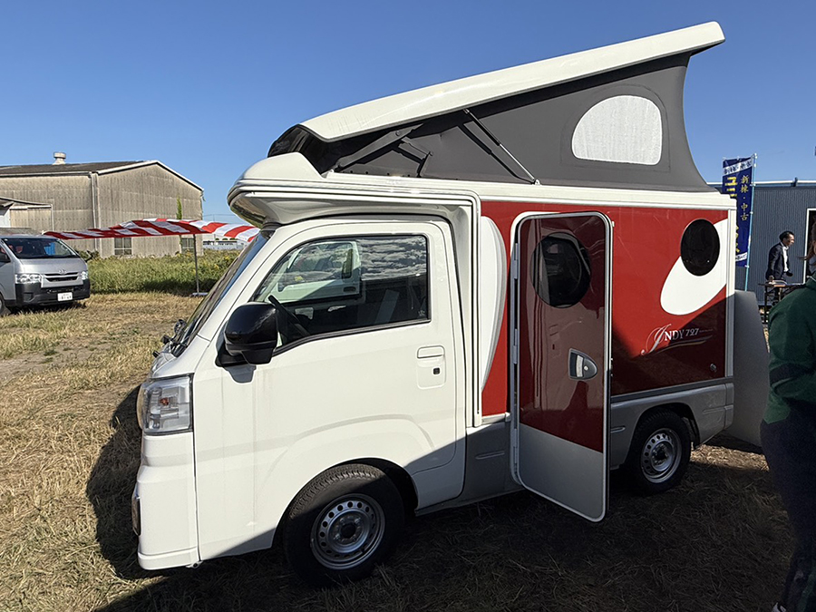 重機のリース以外に、キャンピングカーやエアコンカー(太陽光パネルを積んで、建設現場にエアコンルームを設置するための車)、トイレを積んだトイレ仕様車など、面白すぎるクルマも。↑軽トラを改造したキャンピングカーもレンタルしてるので、変な話、旅行の時はこれ借りて行けばホテル代が浮くのよね。