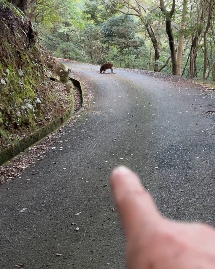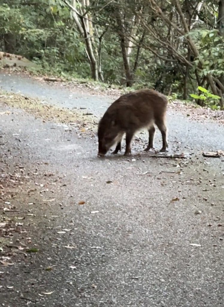 No.582 持ってる男は獣にも出会う sanbuichi-koji, 2025年11月1日 昨日の暴飲暴食を律するために太華山へ。体が重い・・・。山登りする理由はもう一つ。考え事やアイデアを出したい時に登山が一番だから。 ひとしきり頂上で瞑想した後の下山中にその「事件」は起きた。 下山は自動車道をジョギングして降りるのだが、行手に何やら動く物体が・・・猪だった。持ってる男は太華山登山中にかなりの確率で猪に出会う。今日で2回目。しかも結構な至近距離。 一心不乱にどんぐりを食べていて、まだこっちに気付いてない。こっちも迂闊に気が付かれて向かって来られても怖いし…。で、結局1分30秒ぐらい動画を回して様子を見て、自分自身でナレーションも入れながら結構楽しむ。そして、「猪がいなくなるまで帰れまテン!」って大きな声を出してしまって気づかれた!一瞬完全に目が合って、次の瞬間ものすごいスピードで崖下に走って行った。あのスピードでこっちに向かって来られたら一巻の終わりだった(汗) そういえば昨日の家飲み会で、1年前に大向で獲れた猪の肉がまだ冷凍庫にあったのを若者たちが見つけて「食べましょう!」ってことになって豪快に食べたばかりだった。超美味かった。その恨みを晴らしに来たのかも? 日々の感想