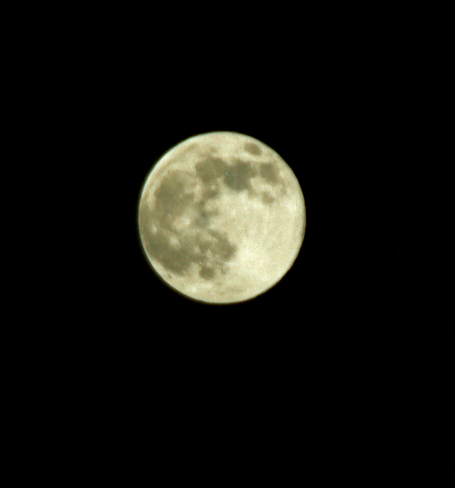 No.586 今年一番のスーパームーン sanbuichi-koji, 2025年11月5日 今日の満月は、2025年のうち最も大きく見える“スーパームーン”らしいので撮ってみた。 いくらiPhoneのカメラの性能が良くなっても、さすがに月は無理なので一眼レフで。今日のスーパームーンについて調べると、普段の疑問が偶然解決する記事があった。「月が昇りたての時間帯には大きく見えることがあるが、これは周囲の他物との比較ができるための錯覚の一種で、実際には月は昇りたてよりも真上にある時の方が地球の半径分(約6000km)だけ近くなるので、真上にある時の方が大きく見えるはず。距離による大きさの違いはほぼ体感できず、錯覚による効果の方が大きいと言えるでしょう」ヘェ〜、ヘェ〜、ヘェ〜!が3つも付くぐらいの驚きだった。感覚的には、満月の夕方、地平線から月が出始めた時「でっか〜!」と思うことがある。あれは遠くの建物や景色が一緒に目に入るので頭の中で比較して錯覚していたのだった。出始めにはあんなに大きかった月が、夜になって上に昇るにつれて小さくなるのは、夜空に月しかないので比較する物体が無くなると小さく見える錯覚って・・・これは雑学で飲み会のネタだな(笑)。 日々の感想