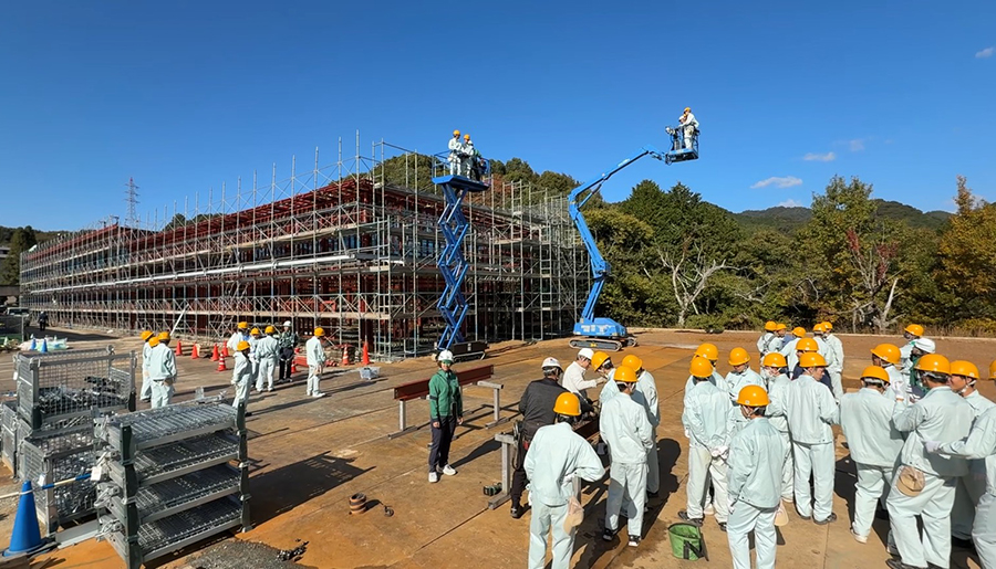 ↑今日の現場。生徒たちに安全帯を装着して高所作業車乗車体験の特別授業。