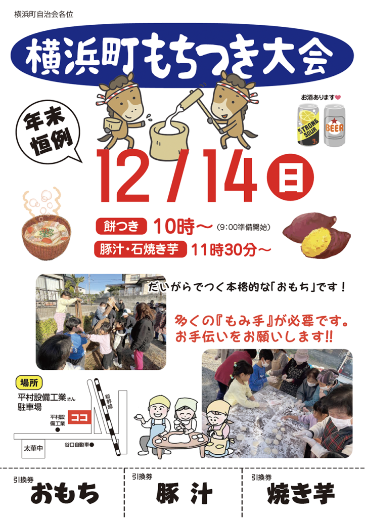 No.602 大事な行事 sanbuichi-koji, 2025年11月21日 町内会恒例の歳末行事、餅つき大会の打ち合わせを役員会で行い、市広報と一緒に配布するチラシもデザイン完成。 年末に町内会単位で餅つき大会を行うところはまず無いので、他の自治会から羨ましがられる。自分たちは朝から準備して、子どもたちに体験をさせながらビールを飲む「ゆるさ」がたまらない!そしてつきたての餅を持って、子どもたちと一緒に高齢独居の家に餅を届けるのも恒例行事。昨年から自分の必殺石焼き芋CARも出場させて『もち・豚汁・焼き芋』を楽しむ一日に。(昨年は猪の肉が大量にあったので、猪肉バーベューも) 大人でも最近は餅は買うだけという人も多く、つくとしてもせいぜい電動餅つき機、「だいがら」なんて見た事もない人の方が多いので、こんな昔ながらの方法でつく餅は美味いに決まってる。 日々の感想