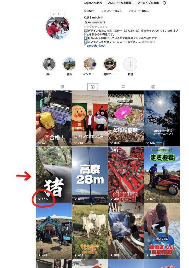 No.604 回る動画とは? sanbuichi-koji, 2025年11月23日 廿日市在住の長女家族が今日の昼間に少しだけ実家に寄ったので半日ほど賑やかに過ごす。インスタの先生でもある長女に「お父さんのイノシシの動画すごいじゃん!PVが1万回超えてるって評判だよ」「PVが1万回?何それ」そんなに気にしてなかったのだが、確かに 猪に遭遇したリール動画だけが1.1万再生と異常に多い。個人のインスタは7月から本気で始めたのでまだフォロワーが162人しか居ないのにどうやって1万人以上に見られる?インスタはとにかく奥が深いので、フォロワーを増やしたりPV(閲覧回数)を増やすコツは無限にあるはず。ただ、あのイノシシ遭遇の動画に「何か」ヒントがあるとすれば、やはり『面白い事実を面白く編集する』ことだろう。あえてBGMも使わず、生音のみだったのも臨場感があったはずだし、最後の最後に衝撃的な展開があったのも「回る」要素なのかな。なので必ずしも「狙って面白い出来事に遭遇できない」から日頃から常にアンテナを張って、すぐに動画を撮れる準備をしておかないといけない事も最低限。 日々の感想