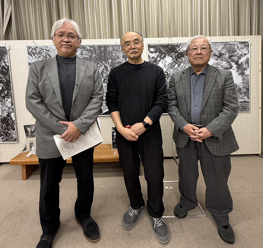 No.622 必見の写真展 sanbuichi-koji, 2025年12月11日 周南市立中央図書館で開催中の、工藤先生の「消えゆく記憶を大判パネルでつなぐ 山口県の空襲を伝える写真展」の会期が明日までだった!ので滑り込みセーフで会場へ。 なんと工藤先生は約2週間の展示期間中ずっと会場におられて来場者の相手をされていたそうで、もう大変なご苦労です。工藤先生とじっくりお話をするのが初めてだったけど本当に「熱い!」方で、改めてアメリカの国立公文書館に保管されている当時のネガフィルムを探す大変さを聞かされて、さらに感動。今回クラウドファンディングで大判パネルを17枚を製作したものの展示だったけど、元データも超ビッグサイズのネガフィルムで、解像度は2億画素ということで約80年前のカメラなのにものすごい高精細。アメリカは、戦時中B-29にこの超高精細カメラを積んだ「偵察機」で高度30000〜32000フィート(約10,000m)の上空から頻繁に飛んで来ては、常に日本全国の軍事工場や市街地の様子を記録して戦略を立てていたそうな。当時の日本の戦闘機は高度1万メートルの高度まで飛んで来れないんだからそりゃあ写真も取り放題じゃろ。もう話が尽きなくて、さらに工藤先生は展示の仕方やパンフレットの作り方やホームページのことでデザインに詳しい人がいたら・・・ということだったので、「それは私でよかったら相談に乗りまっせ!」と意外な展開にも。 記念写真も撮らせていただきました。工藤先生を囲んで、右は会場でたまたま出会った周南文化協会の事務局長の掛川さん。今年は戦後80年の節目ということで、全国18箇所ぐらいで講演会をされて本当に大忙しの先生で、マジで弟子入りしたい!この写真展、パネルをもっと増やして美術博物館でやるレベルのイベントですよ、周南市しっかり支援してください! 日々の感想