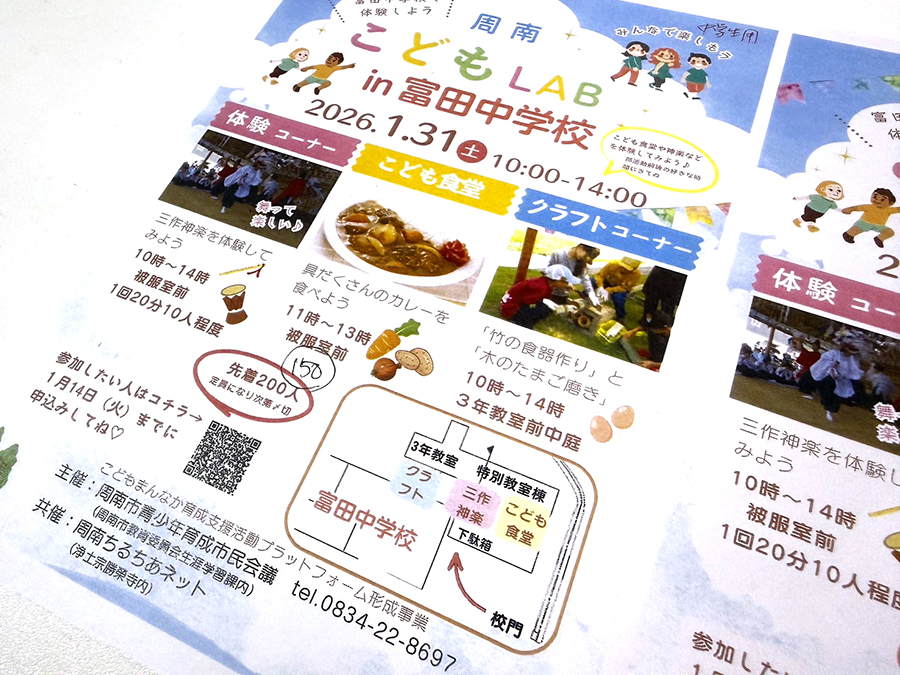 「こどもまんなか育成支援活動プラットフォーム形成事業」という、今までに無かった取り組みを市民会議で受けることになり、[周南ちるちあネット]というこども応援連絡協議会の皆さんと一緒に面白いイベントを計画中。