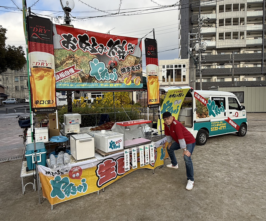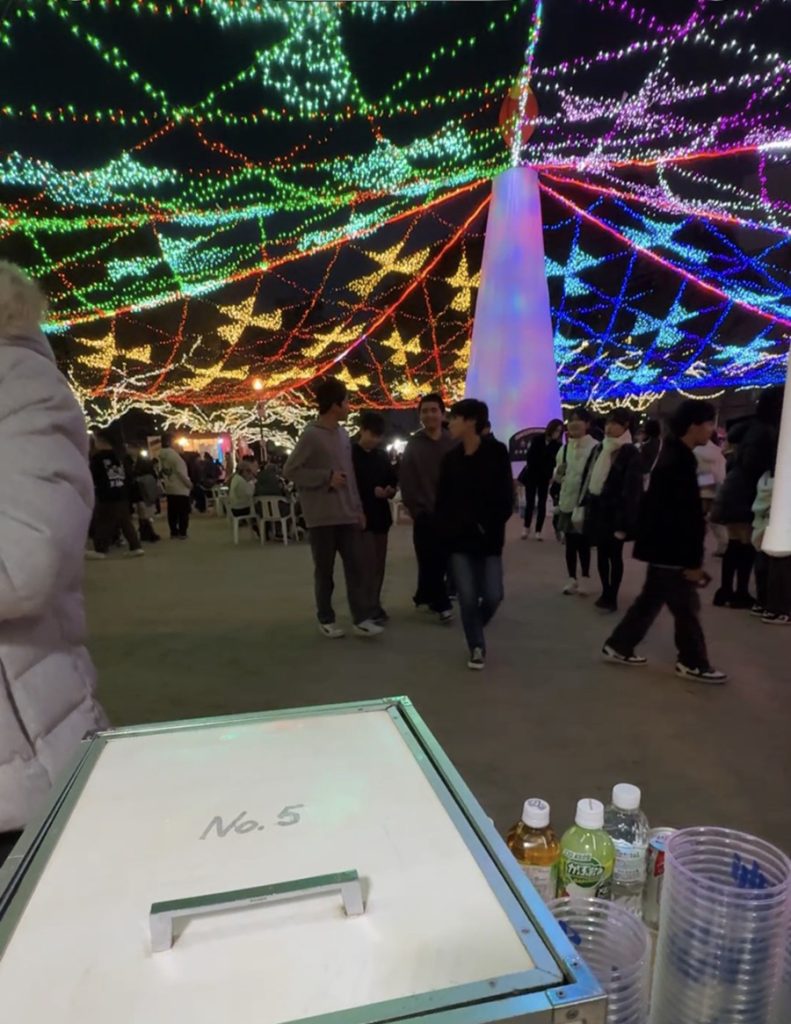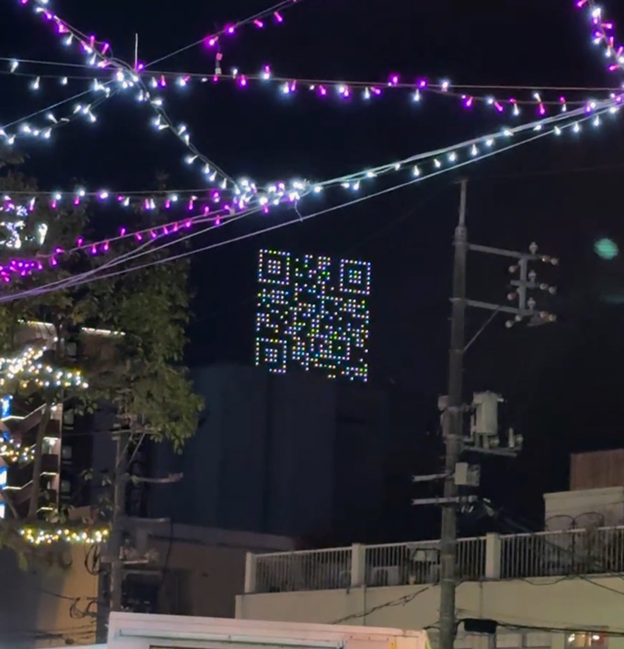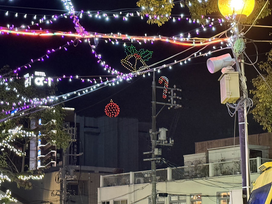 No.631 夏? sanbuichi-koji, 2025年12月20日 疲れた。 ツリー祭りの集中イベントの今日、青空公園に出店したクライアントでもある先輩のお好み焼き屋『やすきゅう』ブースのお手伝い。ここまで統一感のあるPOPのブースは皆無じゃろ!とくやま夏祭りやサンフェスタ新南陽などの大規模イベントに出店する度にPOPや什器の配置、導線の見直しなど、毎回ブラッシュアップを重ねて、今日はこの販売ブースは仲良し4名で完璧なオペレーションを組んで今までで最も効率的にお店が回った。(ちなみに歩いて5分の位置にやすきゅうの店舗があるので、先輩親子はひたすら店の鉄板で商品を焼き、青空公園までピストン輸送)暑いくらいの天候もあって、真冬のイベントなのに生ビールが飛ぶように売れた。実際に最後まで自分は半袖! 生ビールサーバーの正面に巨大ろうそく!という絶好のロケーションだったので、ビール担当の自分はここの場所から一歩も動かないまま午後4時から8時半まで、約300杯の生ビールを注ぎまくった。 しかもこの場所から見える右手に ドローンショーまで見えるというラッキー。 この空に浮かんだドローンによるQRコードは、実際にカメラで撮るとホームページへリンクするらしい。すごい時代になったものだ。 日々の感想