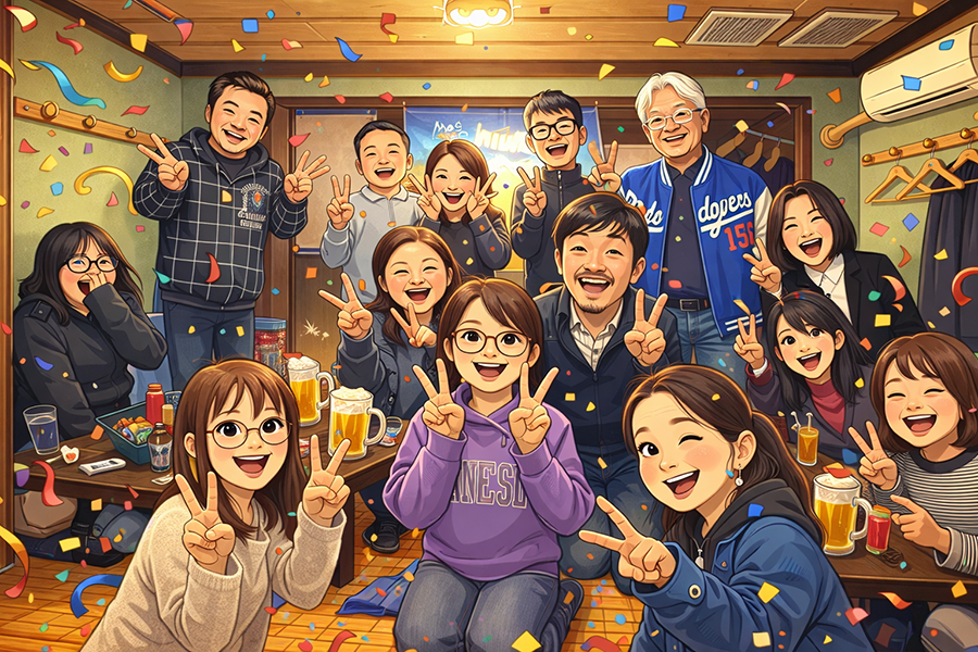 最後に店内で全員で写真〜からのChatGTPで楽しいイラストに。Aiを活用すると、全然似てないけど全部笑顔の面白いビジュアルに変換してくれる。ただ生ビールのジョッキなんて一つも無いのに勝手に生成(笑)。
