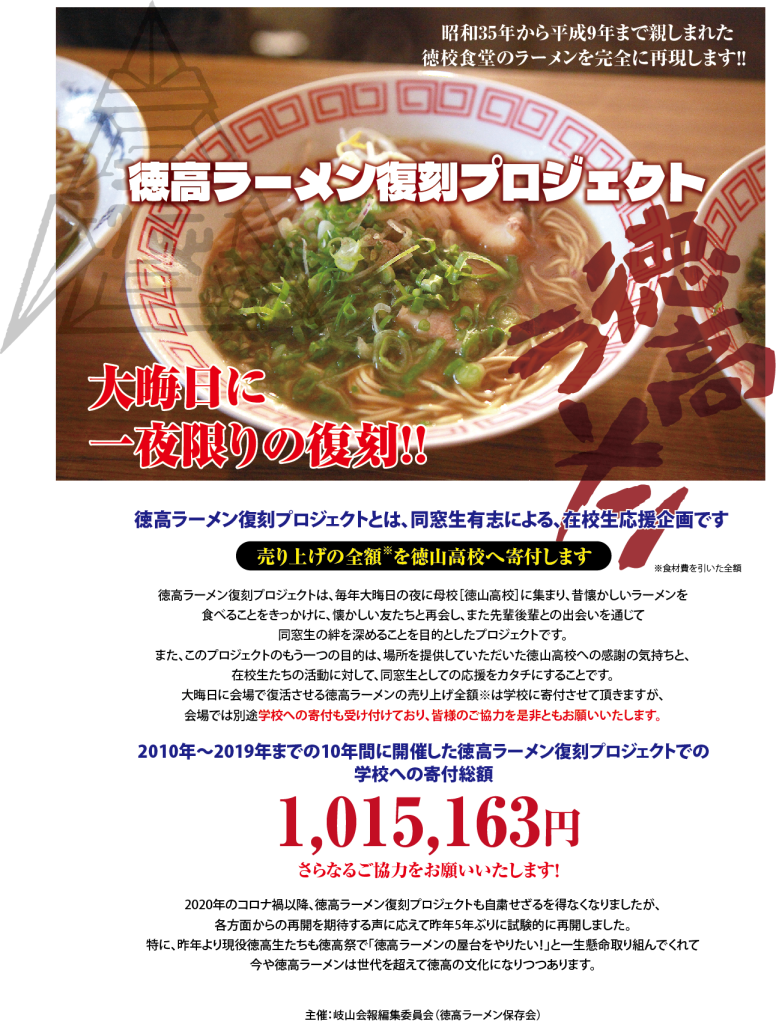 No.641 明日のために! sanbuichi-koji, 2025年12月30日 徳高ラーメン復刻プロジェクト前日。いつも当日のスタッフの手伝いには後輩たちが大勢来てくれるのだが、一番大変なのは前日なので、本当は今日いくらでも「手」が欲しい〜!のだけど、結局今日は4人で長机を倉庫から出したり、椅子を体育準備室から運んだり、会場設営から始まって、400名分のラーメンのための厨房へのガス装置等の運び込み、寸胴等のセッテイング、その後スープの仕込み、チャーシュー50kgの煮込みなど、結局まだ徳高ラーメンを次世代に繋ぐには人材がおらん・・・・。ラーメンの準備以外にも、水やお茶の大量買い出し、コーヒーコーナーの準備、昨年から石焼き芋もメニューに入れているので、もうとんでもない程やることがある。今日も準備をしていたら、「ラーメンは今日食べれますか?」と呑気なことを言って訪ねてくる同窓生?が…。“一年で大晦日だけ徳高で昔の食堂のラーメンが食べられる”ことが、どれだけ普通じゃないか、いつか同窓生がわかってくれる時が来るだろうか。 明日会場で配布するチラシも手を抜かない! 日々の感想