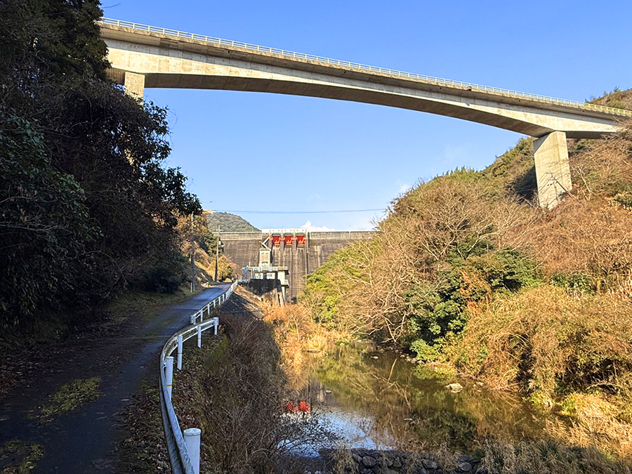 クルマを降りてこの道を歩くとダムの真下まで行くことができた。そしてこのアングルから撮ると、ここも「逆さダム」状態になってこのまま額に飾れそうな美しい写真に。ここも桜が咲く頃来たら最高だろう。