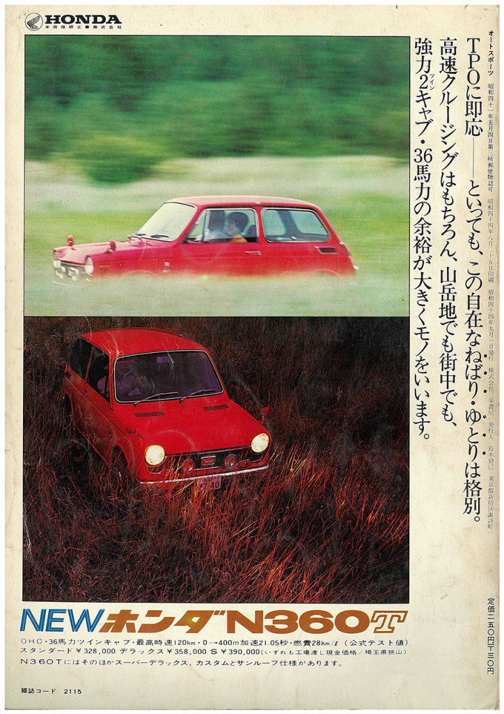 No.667 奇跡の週末の二日目にしたことは sanbuichi-koji, 2026年1月25日 なんと、「昼寝!」午前中溜まっている雑務とか色々やっていたら結局昼過ぎてしまった。出かけるタイミングを失って、昨日の登山の疲れもあってウトウトしてしまい、このまま寝たら気持ちいいだろうなぁ〜と思ってデスクで昼寝をしてしまった。めちゃくちゃ気持ち良かった・・・ 昨日預かって持って帰った1970年前後のモータースポーツ誌(約2000冊)の表紙画像をデータにして整理する作業は相当時間がかかりそうだけど楽しい、だけど自分的に一番興味深いのは、雑誌の毎号の裏表紙の自動車メーカーの広告。 50年以上前のこんな広告データなんて、今どこを探しても残っていない。 やたらと日産とHONDAの広告が多い。日産とHONDAは当時日本のモータースポーツ産業を牽引した両巨頭なので広告にもふんだんにお金をかけていた様子が伝わってくる。[ホンダN360T]の広告には値段まで載っている。燃費は28km/l、スタンダードが¥328,000。この広告を全てアーカイブしたら、とんでもない自動車産業の広告データベースになるかも。 日々の感想