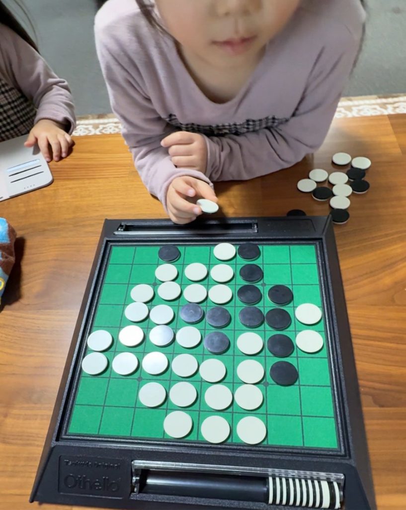 No.674 オセロブーム再び sanbuichi-koji, 2026年2月1日 孫が遊びに来た時は、我が家のリビングはとりあえずおもちゃを全部ぶちまけて戦場みたいになるのだが、最近コレが我が家でマイブームになりつつある。 妻が大事に保管していた昔のオセロゲーム。多分30年ぐらい前のヤツ。5歳の孫とオセロゲームができるなんてすごい(感激)。しかも、駆け引きとか関係ないから結構強くて負けてしまったぞ!そして孫と対戦した後は、孫の母親、つまり娘から「お父さん真剣に対戦しようよ!」と忖度無し、500円を賭けての真剣勝負。絶対に勝つ自信があったけど、なんと2連敗!「頼む!もう一回やってくれ!」と泣きの一回をやってようやく勝てた…。けど負け越しで終わってしまった。このまま終わると思うなヨォ〜!こういうアナログなゲームが一番。 日々の感想