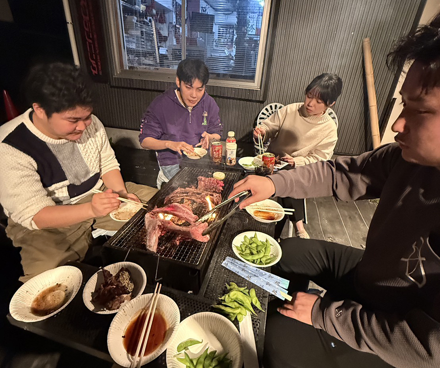 No.696 バーベキュー日和 sanbuichi-koji, 2026年2月23日 周南公立大の起業チームとの「遅ればせながらの新年会」。 急に「やりませんか!」と言ってきたのでメインの食材は冷凍庫にパンパンに詰まっている骨付きの猪肉。最近は、彼らが経営している合同会社R’ingsから仕事の相談や依頼を受けることもあって、公私に渡って濃い付き合いをしている。ただ彼らは若いので酒の飲み方が「学生ノリ」でハンパないので、同じように飲んでると次の日が大変なことになってしまう(笑)。彼らは周南公立大の新館のカフェも経営しているので料理の方も結構できる。バーベキューをやりながら、「この猪の骨で出汁をとってラーメンを作りましょうよ!」と台所から寸胴を引っ張り出してラーメンスープを作り始めた。麺は強力粉で我が家自慢の製麺機で・・・のはずが、製麺機の調子が悪くて細麺ができない〜!もうみんなお酒が入っているので適当に最後の手段「手でこねた小麦粉の塊を包丁で細切りする」という荒技でラーメンを作ったが、とても食えたもんじゃない。そして苦肉の策でカップラーメンの麺だけ使用して猪骨ラーメンを完成させた。味は、よぉ〜分からんかった(泣)。 日々の感想