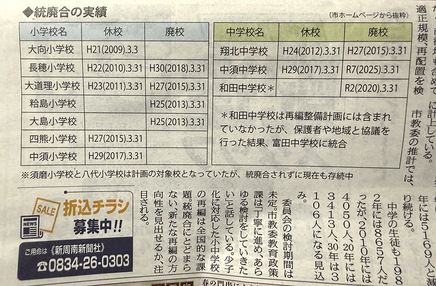 No.707 廃校利活用をやる気が全く無い市 sanbuichi-koji, 2026年3月6日 昨日の日刊新周南の一面記事「市街地含め、小中学校再編へ」という内容と市内の小中学校の統廃合で、現状の「休校」と「廃校」の学校の一覧表が。 2年前の自分が市議選に立候補した時の最大の関心事で公約「廃校を利活用した街おこし」。あれから2年経つのに、な〜〜〜んにも変わってない。もう周南市は休校だろうが廃校だろうがどうでも良いのだろう。大向小学校などは16年以上も休校のまま。学校は廃校にならないと市の普通財産として利活用できないけど、実際には大向小学校の教室には地域の「要らないもの」が詰め込まれていて、物置がわりに使われているという話も聞く。使いたい人(団体や企業)がお金をかけて責任持って整備して有効活用すれば、中山間地域の『起爆剤』に絶対になるはずなのに。全国には廃校を有効活用してヒトや情報が集まる基地になった成功事例が山ほどあるのに、どうして周南市は動かないんだろう・・・・という声を上げ続けて動き続けて・・・もう疲れました、本当に。 日々の感想