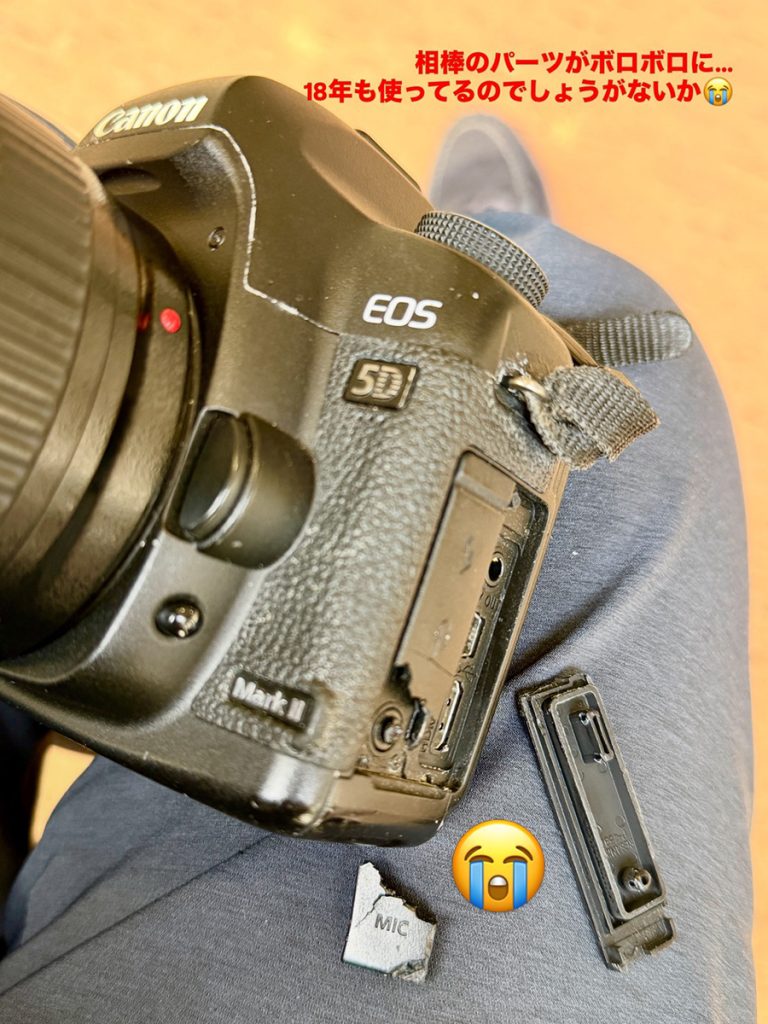 No.708 相棒 sanbuichi-koji, 2026年3月7日 文化会館で撮影の仕事だったので最近あまり出番が無い一眼レフを持って出る。そして撮影がひと段落して休憩中に事件が・・・(というほど大した事ではないが) 何気なくカメラをいじくりまわして「なんとなく」側面のコネクタに蓋をしているゴムのパーツを触ると、ボロボロとちぎれて悲惨な状態に・・・。完全にゴムが経年劣化で手で触っただけでボロボロ。2008年に購入して以来、完全に「相棒」だったのでショックだけど18年も使っているのでしょうがないか・・・との思いも。当時はCANON一眼レフの最高の性能の高級機だったけど、今では「iPhoneのカメラの方が賢い!」と思うようになった。そりゃあ18年も前の技術はもう辛いかな?でも今でも写真の品質的には「自分の腕次第で超一級品の写真が撮れる」カメラなので、まだまだ一緒に頑張りうぜ!ゴムのパーツは新品に取り替えてやるからな、相棒よ。 日々の感想