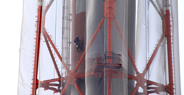 高所で働く男達。 wizzplanning, 2012年11月6日2024年4月8日 見慣れた工場の煙突が残念な色に塗り替えられて行く…。 いつの間にか先端部分が「青」に塗り替えられた。見逃した~ 今日も作業するはずだ、と思って遠石八幡宮の参道の踊り場へ。(ここしか撮影ポイントが無い!) 肉眼では何となく人がいるような感じがしたが、 うお~!なんちゅう高い所に! 結構な数の人が作業をしている。 確かに「人の手」で塗り替えられていた。 あそこに何とか登らせてもらえないもんかな? 未分類